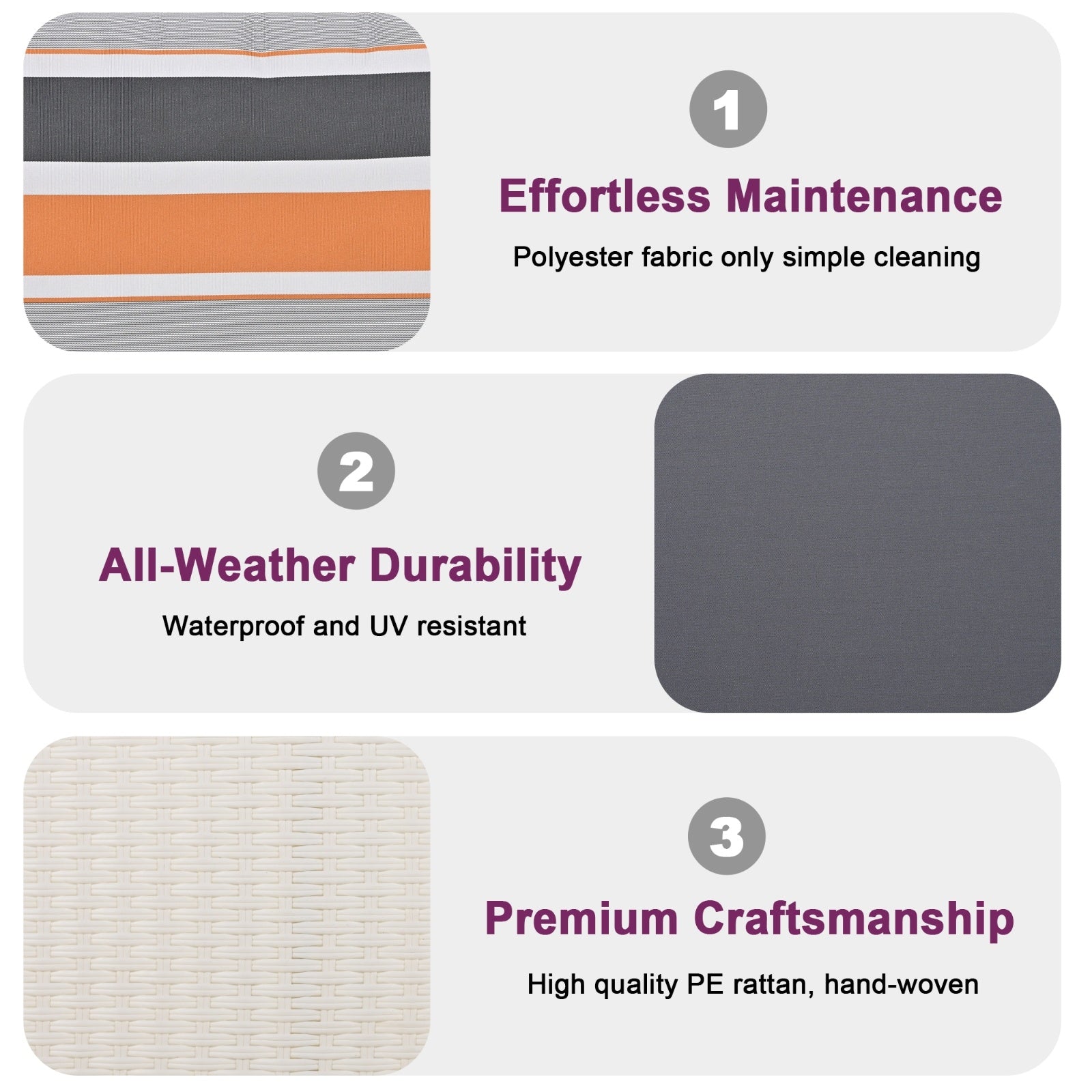 - Vibrant Pillows: Accompanied by a generously sized seat cushion and back cushion, this ensemble is further enhanced by the addition of two vibrant pillows. These colorful accents not only offer an extra layer of comfort but also allow for personalized placement – whether nestled at your side or gently propped behind – ensuring a truly indulgent relaxation experience.